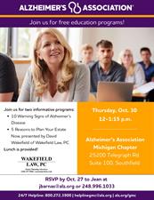 Thursday, Oct. 30 Alzheimer’s Association Free of charge but please RSVP by Oct. 27 to Jean at jbarnas@alz.org or 248.996.1033